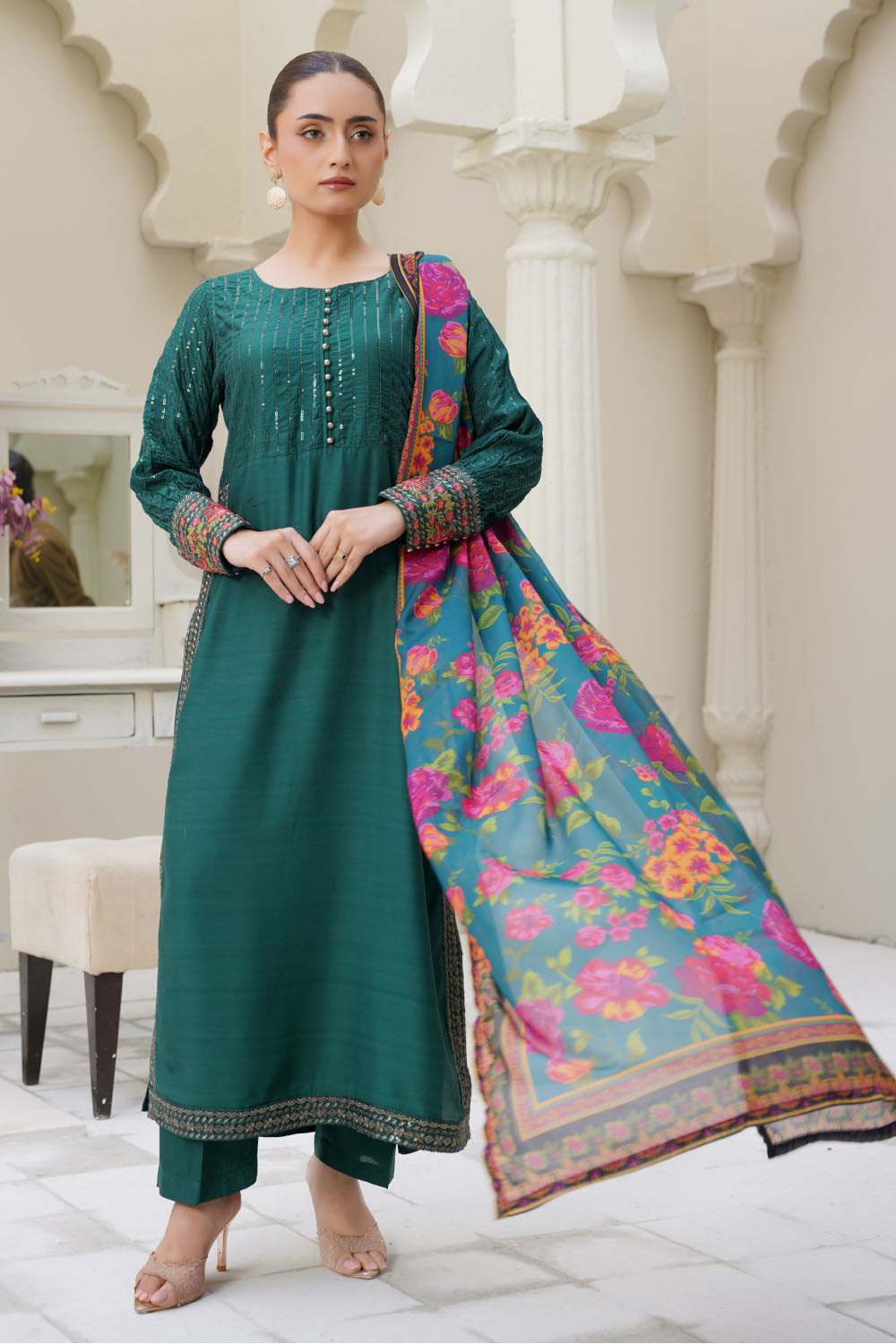 3 Piece seqiun embroidered viscose Suit (Shirt+Dupatta+Trouser) Buttons with loops on neckline. Sequin embroidered neckline...