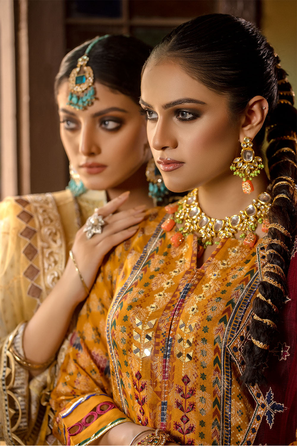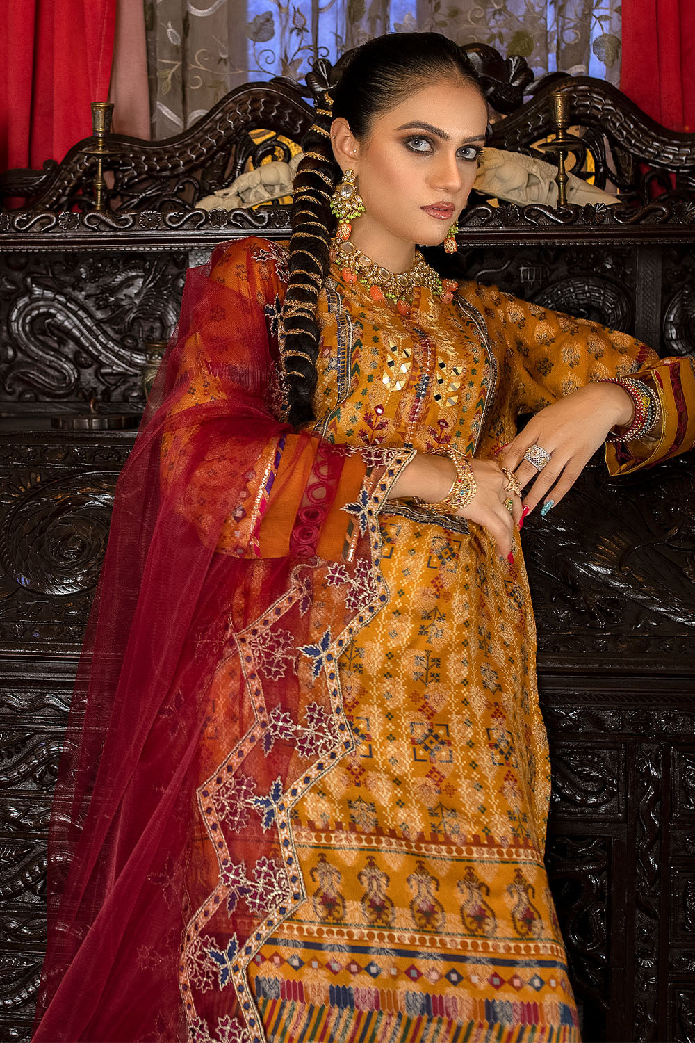 - Mirror embroidered jacquard cotton shirt with lacing details on sleeves. The overall look is beautified by organza border styled with pintex and laces. mirror work on daman.