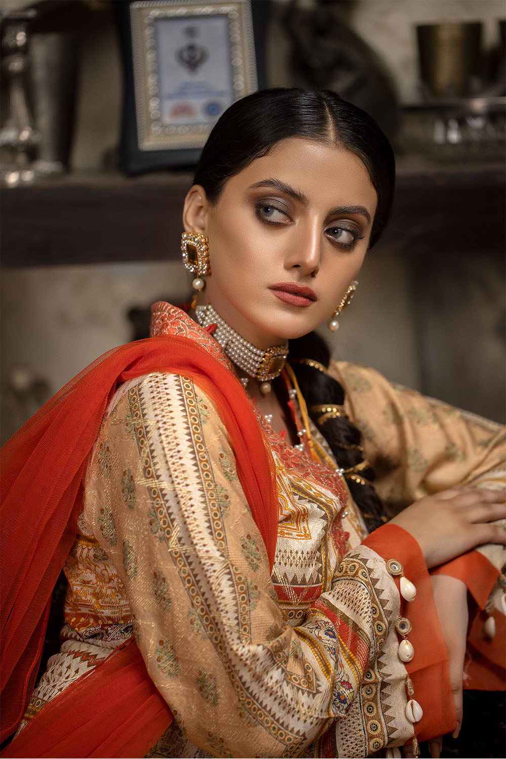 - Embroidered jacquard shirt adorned with fabric loops and pearls work on neckline. The overall look is completed with hand made tassels on sleeves. Embroidered organza daman.