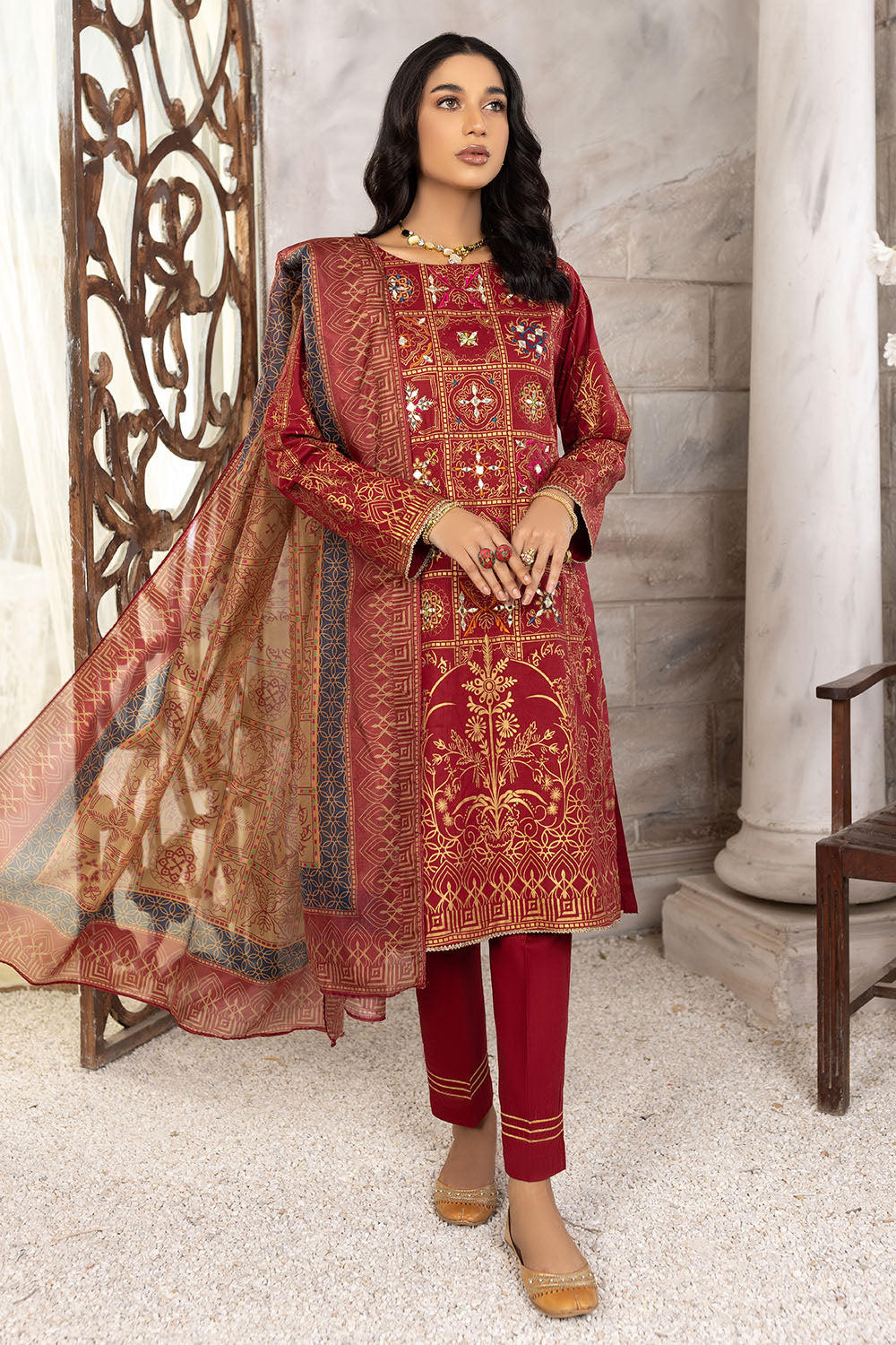 - Mirror embroidered and screen printed cotton lawn shirt with lacing details on sleeves and daman. Round Neckline.