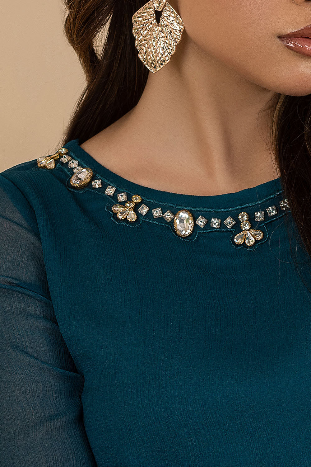 - Crinkle chiffon maxi with hand embellishment on neckline.