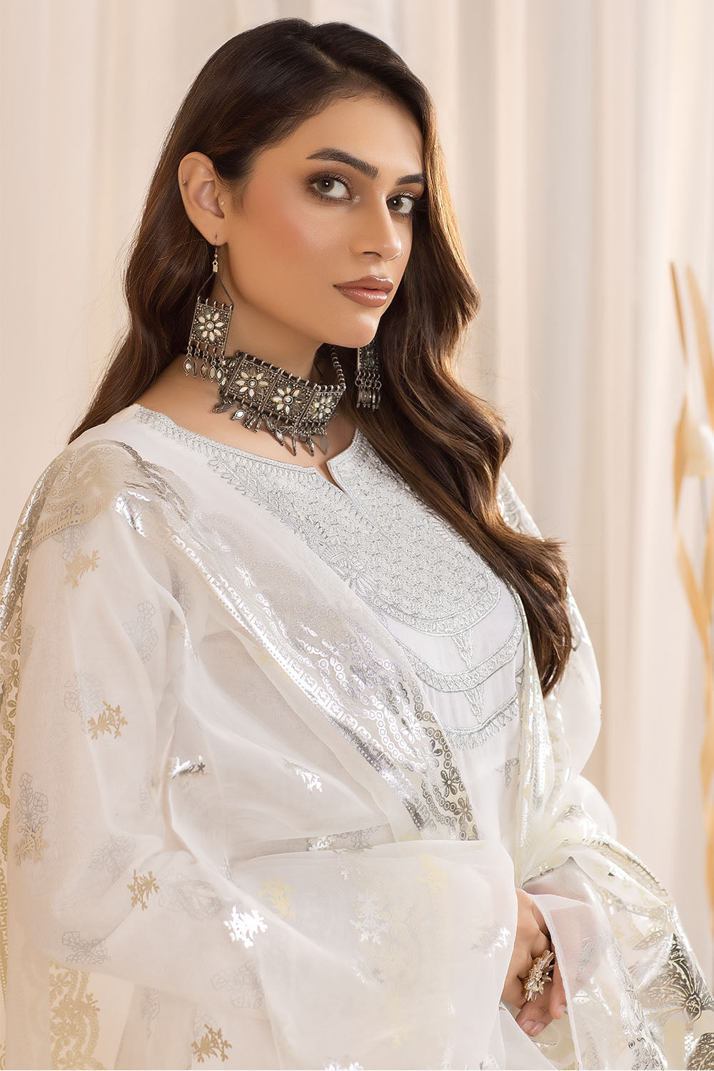 - Embroidered and screen printed cotton lawn frock with embroidered sleeves and embroidered organza border. Border is ensemled with gotta hand made tassles.