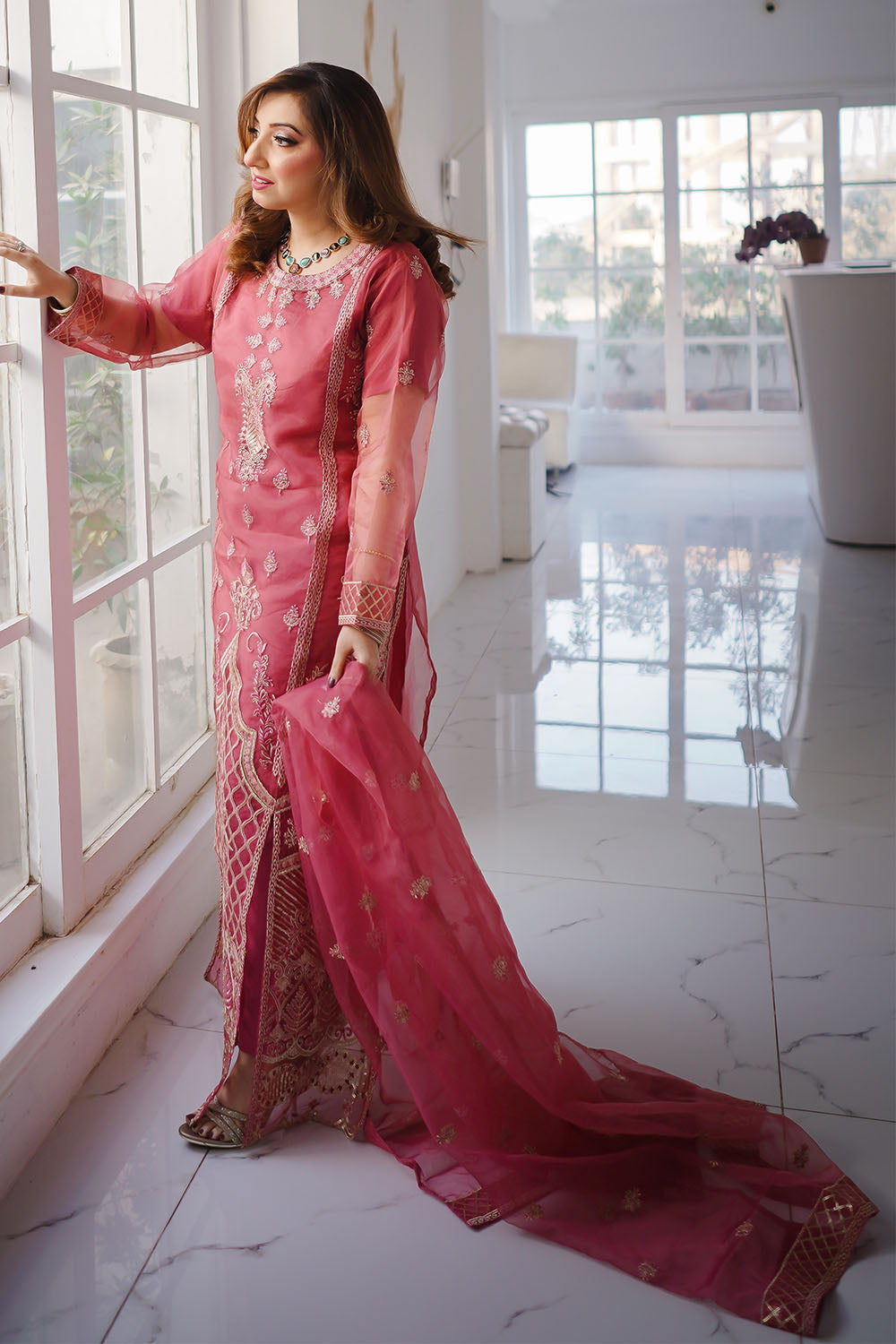 - Shirt: Heavily sequin embroidered organza front open style A-line long shirt. Embroidered sleeves. Cut work at bottom.