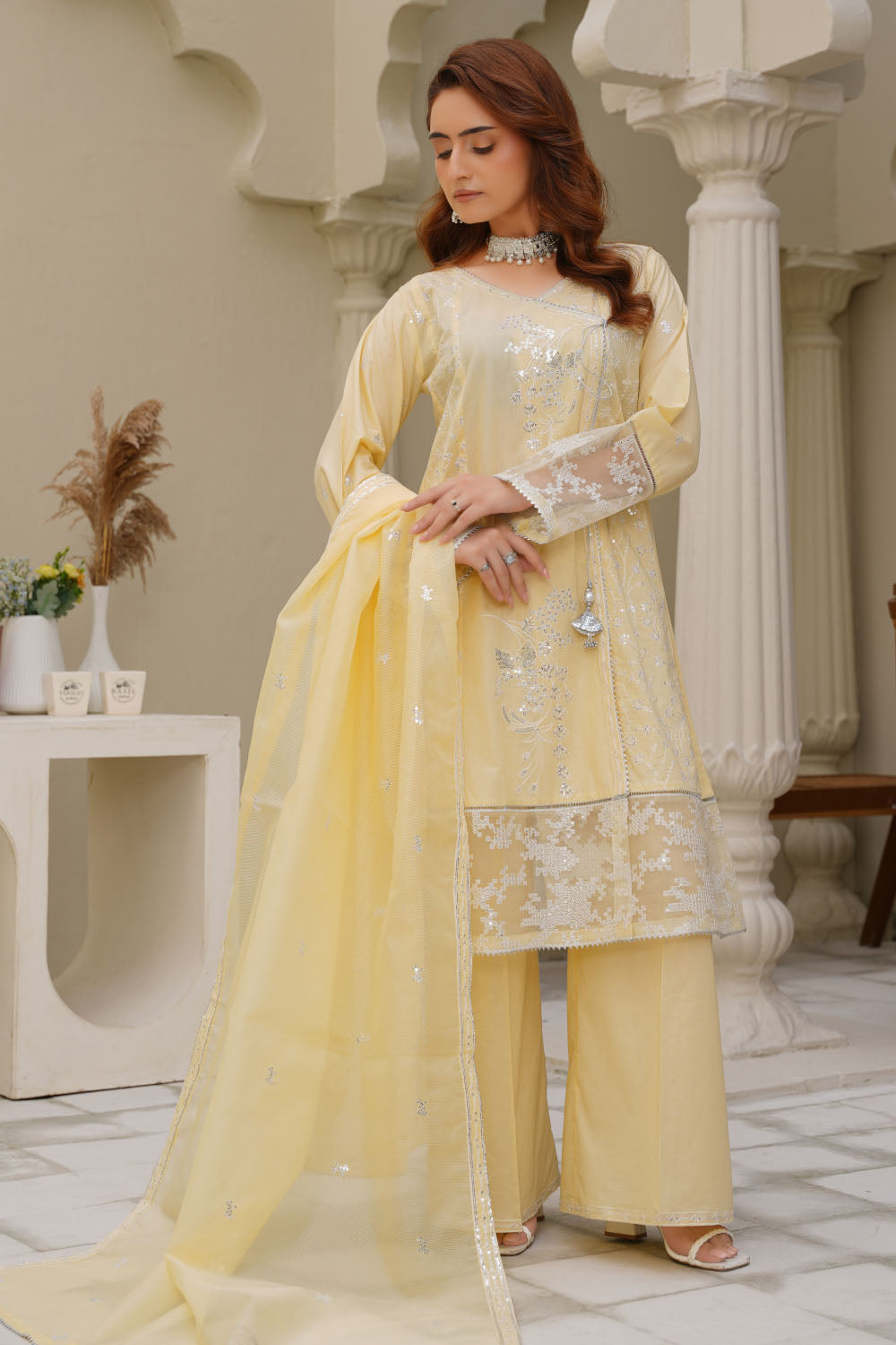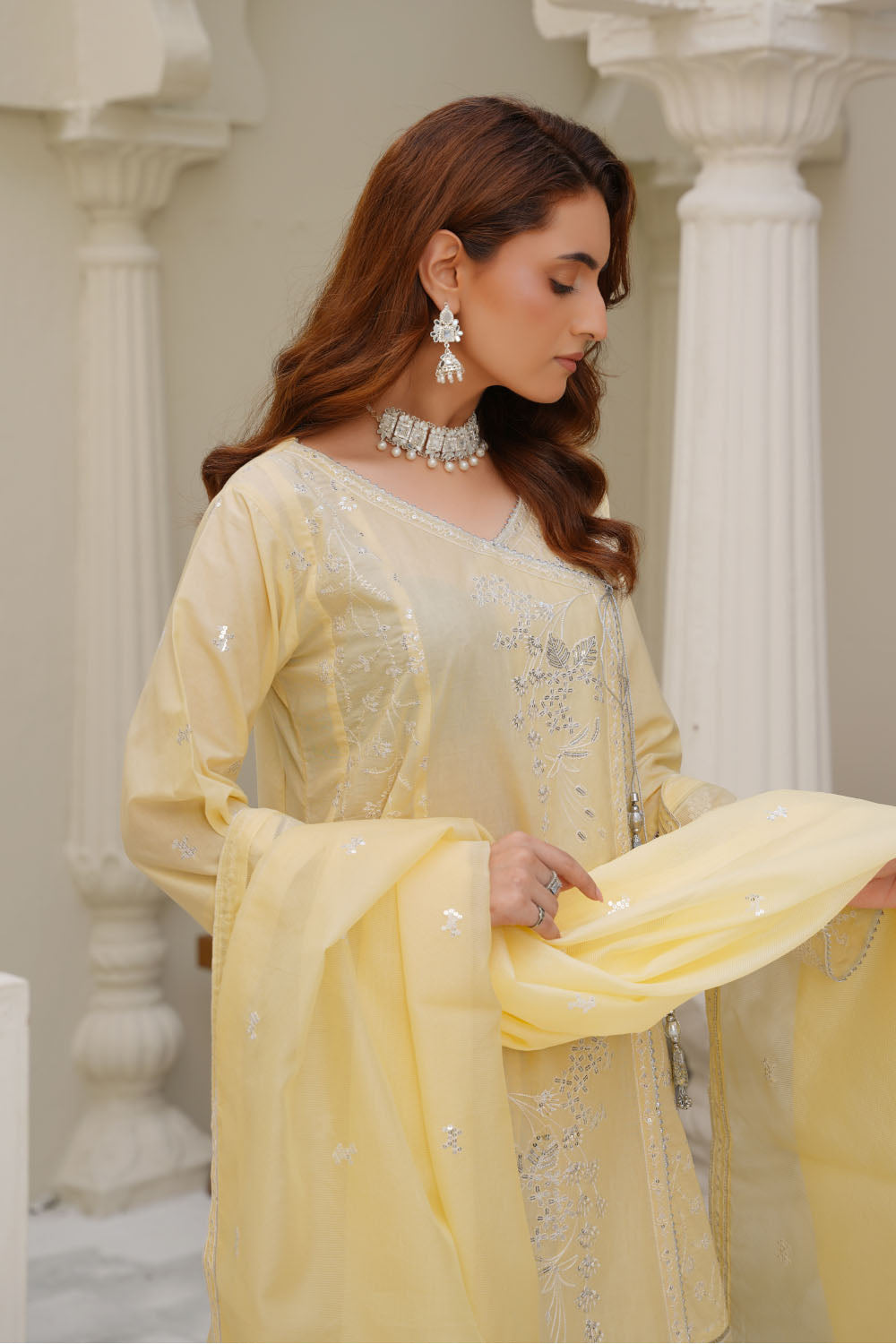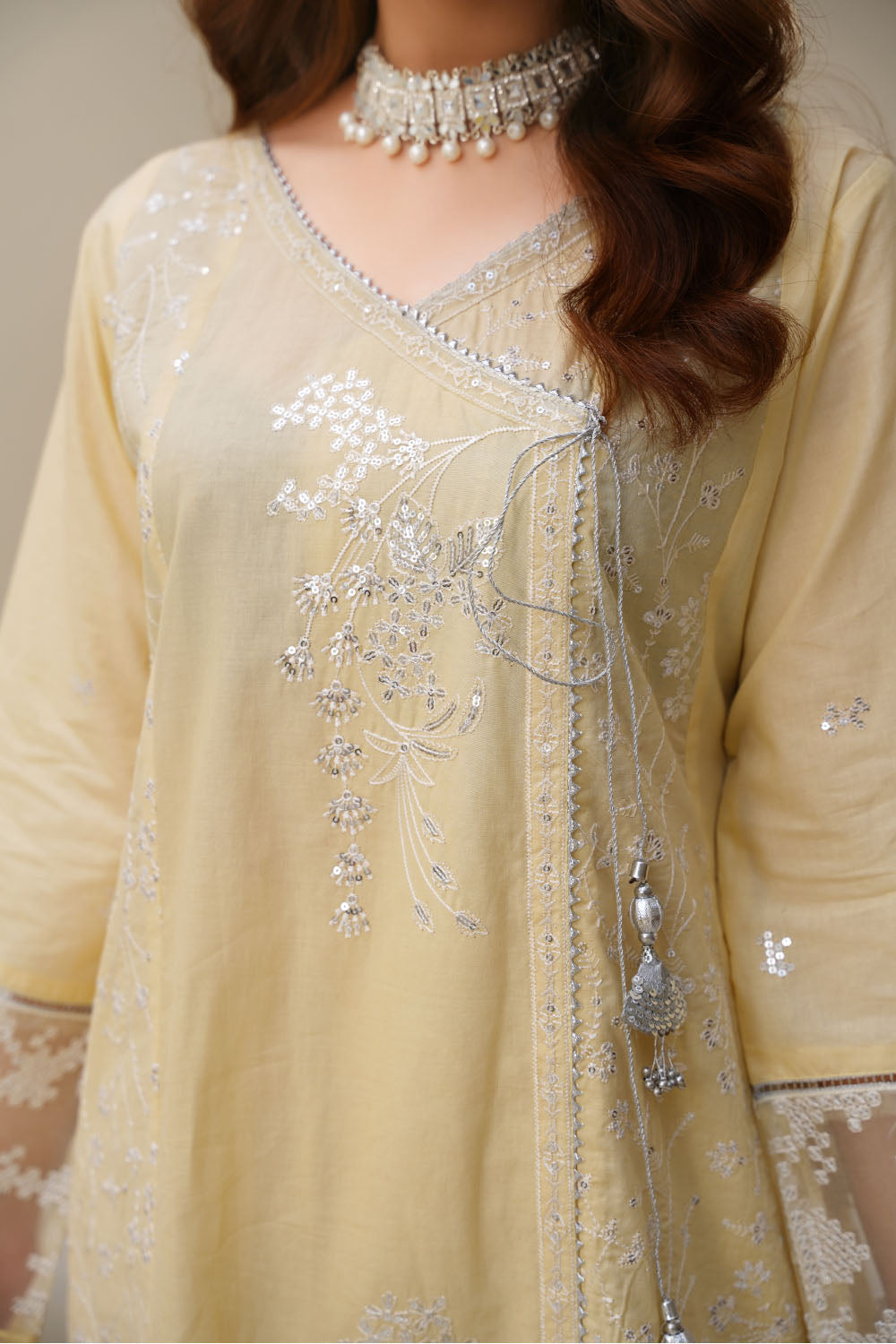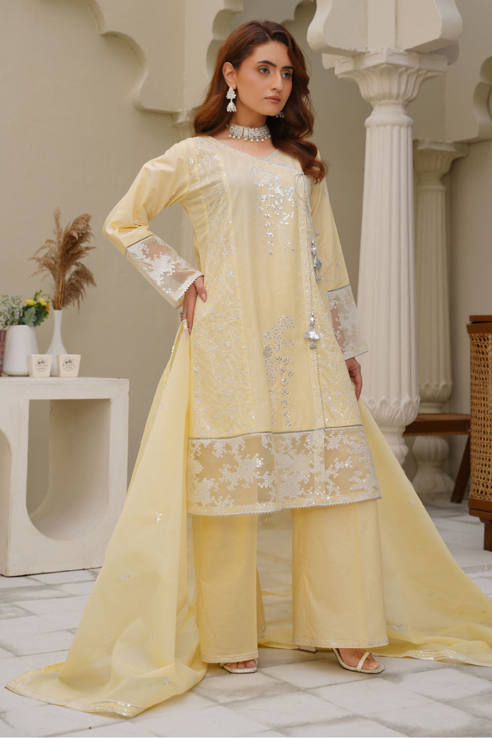 - 3 Piece embroidered cotton Lawn Angrakha Suit