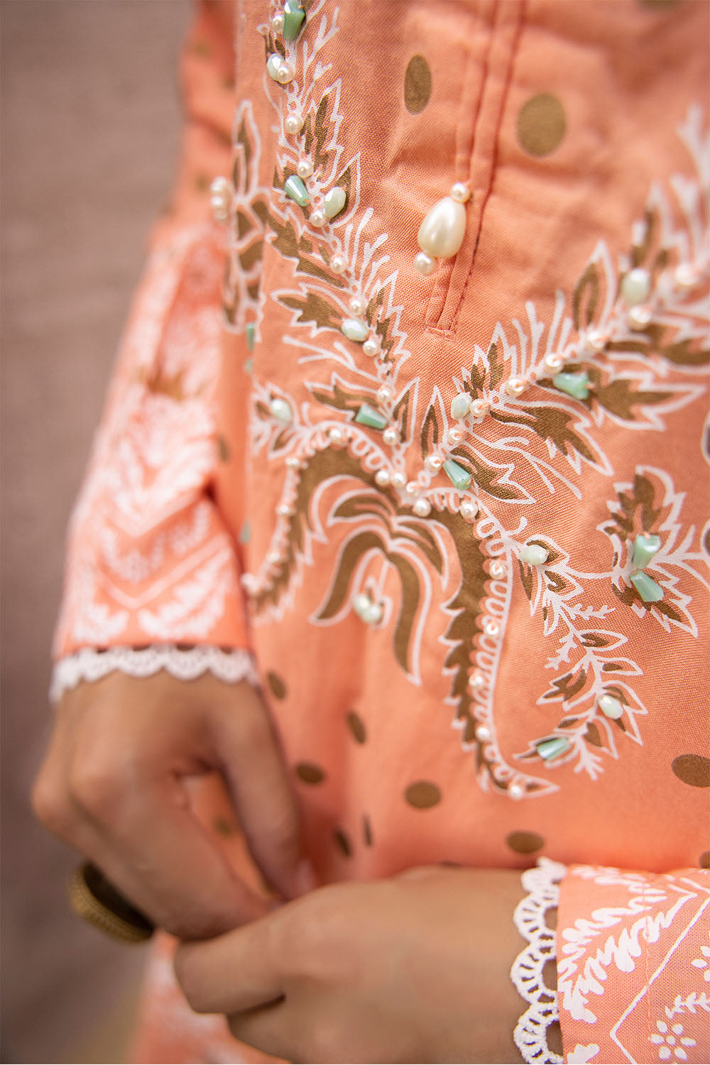 - Screen printed linen shirt styled with hand made crystals and pearls details on front added with hand made buttons on neckline. Lacing details on sleeves and daman.